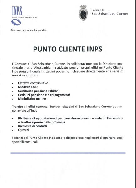 Il Comune di San Sebastiano Curone, in collaborazione con la Direzione Provinciale INPS di Alessandria, ha attivato presso i propri uffici un Punto Cliente Inps presso il quele gli utenti potranno usufruire di una serie di servizi che si elencano nella locandina che si allega.