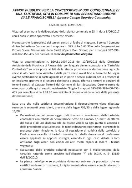 AVVISO PUBBLICO PER LA CONCESSIONE IN USO QUINQUENNALE DI UNA TARTUFAIA SITA IN COMUNE DI SAN SEBASTIANO CURONE VIALE FRANCISCHELLI (presso Campo Sportivo Comunale).