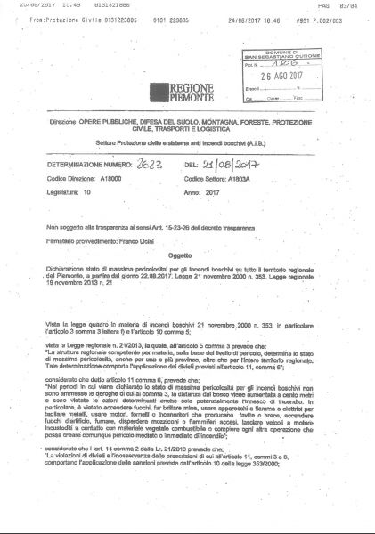 Con DD 2623 DEL 21.08.2017 la Regione Piemonte ha dichiarato lo stato di massima pericolosità per gli incendi boschivi su tutto il territorio regionale a partire dal giorno 22 agosto 2017