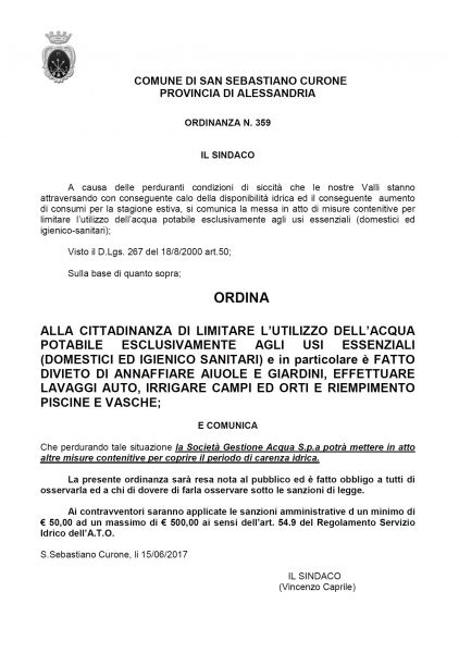 Si ripubblica l'ordinanza di cui sopra con preghiera di limitare l'uso di acqua potabile ai soli fini domestici ed igienico sanitari in questo periodo di grave siccità.