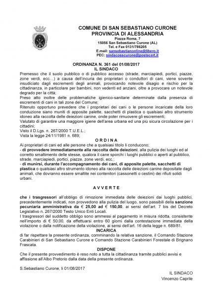 Si pubblica l'Ordinanza Sindacale numero 361 del 1/8/2017 per la raccolta delle deiezioni dei nostri amici cani dato atto che i loro padroni in molti casi non si dimostrano "rispettosi" del decoro e pulizia del nostro paese.