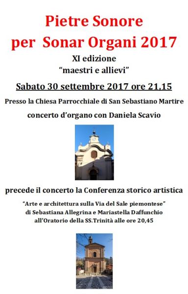 SAN SEBASTIANO CURONE: Sabato 30 settembre 2017 alle ore 20.45 presso Chiesa SS. Trinità Arte e Architettura ligure sulla Via del Sale piemontese.