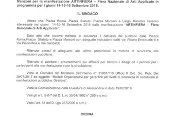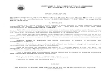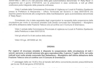 ORDINANZA SINDACALE N° 376-18 MANIFESTAZIONE AUTOMOBILISTICA 5 RALLY RACE TERRE DEL TIMORASSO