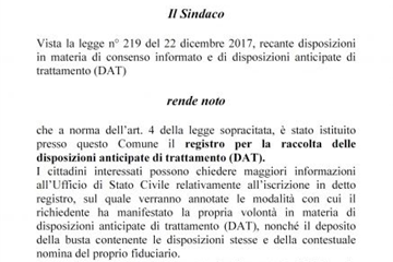 ISTITUZIONE DEL REGISTRO COMUNALE PER IL DEPOSITO DELLE DISPOSIZIONI ANTICIPATE DI TRATTAMENTO (DAT)