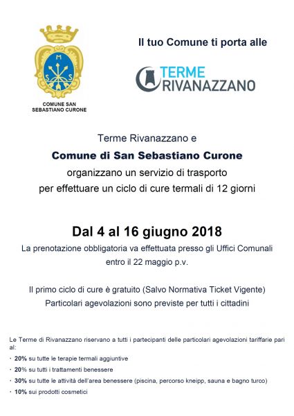 Come ogni anno il Comune di San Sebastiano Curone in collaborazione con le Terme di Rivanazzano organizza un servizio di trasporto per effettuare un ciclo di cure termali dal 4 al 16 Giugno 2018.