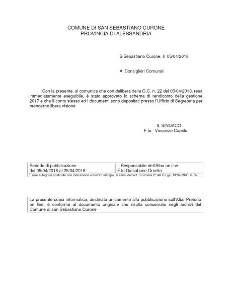 Si comunica che con deliberazione G.C. n. 22 del 05/04/2018 é stato approvato lo schema di rendiconto della gestione 2017 e che il conto stesso e i documenti sono depositati presso l'Ufficio di Segreteria dal 5/4 al 25/4/2018