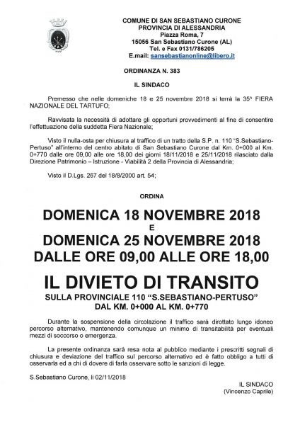 CHIUSURA AL TRAFFICO TRATTO STRADA PROVINCIALE 110 SAN SEBASTIANO-PERTUSO NELLE DOMENICHE 18 E 25 NOVEMBRE 2018 DALLE ORE 9,00 ALLE ORE 18,00