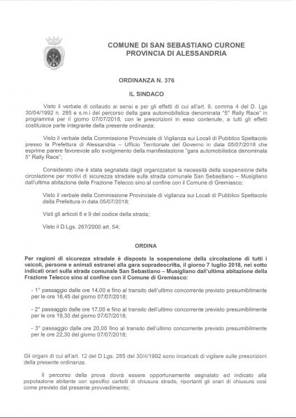 Si allega ordinanza sindacale n° 376/2018 contenente le prescrizioni relativamente alla manifestazione automobilistica in oggetto.