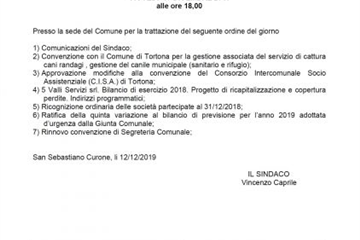 CONVOCAZIONE CONSIGLIO COMUNALE - GIOVEDI' 19-12-2019 ORE 18.00