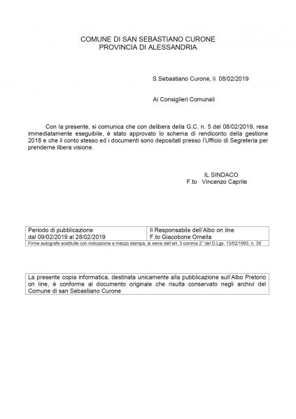 Si comunica che con deliberazione della G.C. n. 5 dell'8/2/2019 é stato approvato lo schema di rendiconto della gestione 2018 e che il conto stesso e i documenti sono depositati presso l'ufficio di segreteria dal 9/02/2019 al 28/02/2019.