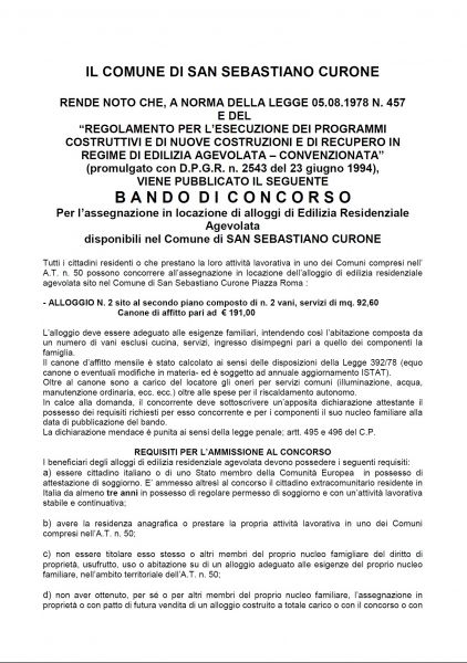 BANDO DI CONCORSO PER L'ASSEGNAZIONE IN LOCAZIONE DI ALLOGGI DI EDILIZIA RSIDENZIALE AGEVOLATA DISPONIBILI NEL COMUNE DI SAN SEBASTIANO CURONE
