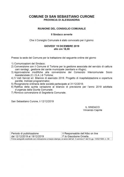 E' convocata la riunione del Consiglio Comunale in adunanza straordinaria di prima convocazione il giorno 19/12/2019 alle ore 18.00