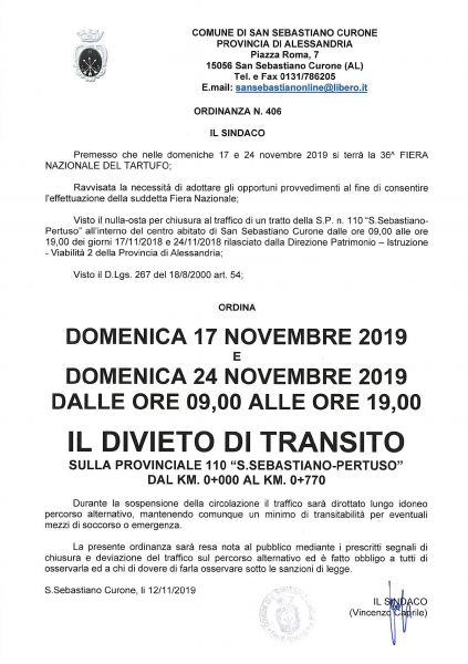 ORDINANZA DI CHIUSURA STRADA PROVINCIALE 110 "SAN SEBASTIANO-PERTUSO" DAL KM. 0+000 AL KM. 0+770