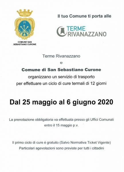 Il Comune di San Sebastiano Curone come ogni anno organizza in collaborazione con le Terme di Rivanazzano un servizio trasporto alle Terme di Rivanazzano per ciclo di cure termali dal 25 maggio al 6 giugno.