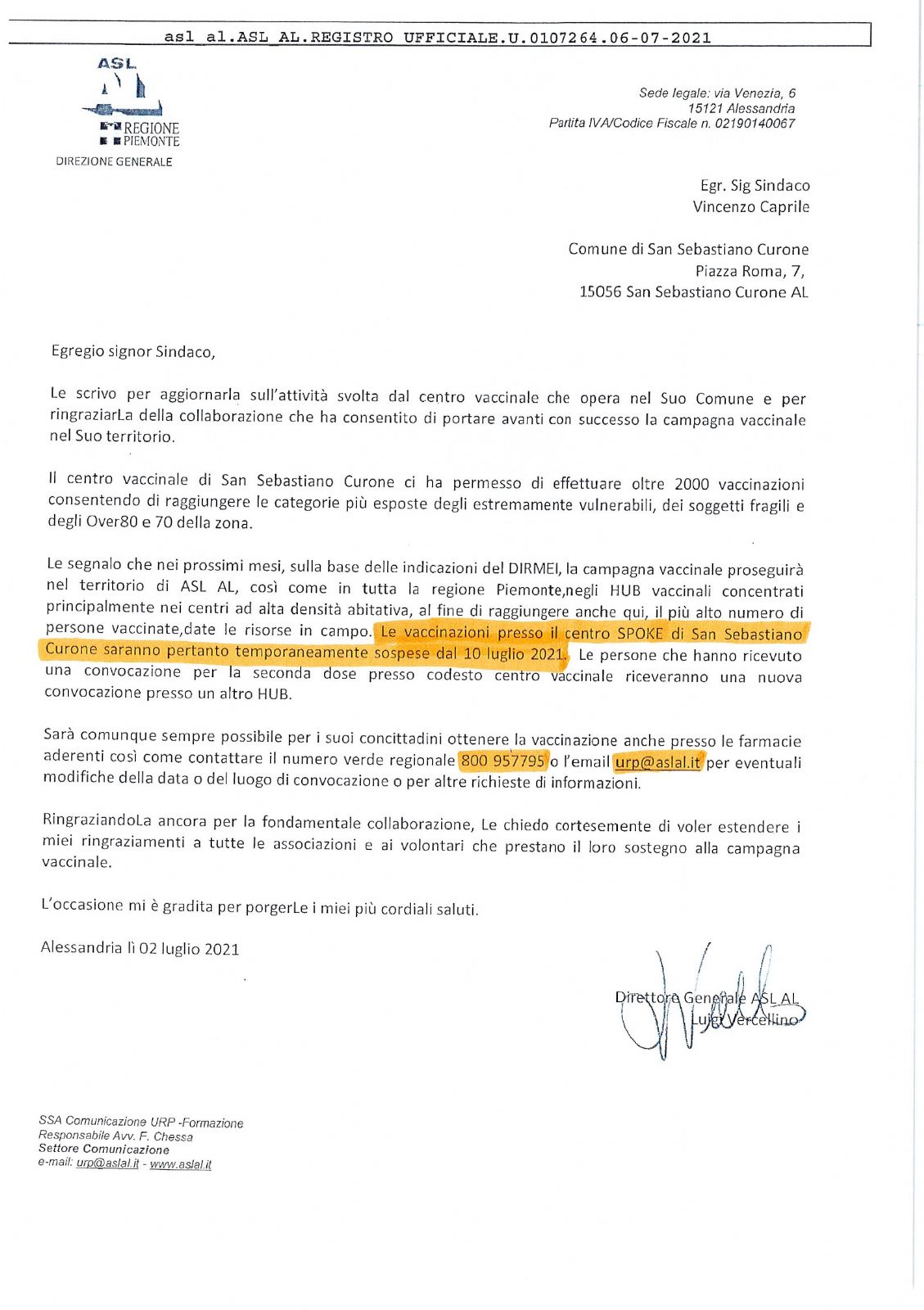 Nota ASL-AL al Sindaco in merito alla sospensione temporanea delle vaccinazioni presso il centro SPOKE di San Sebastiano Curone dal 10 luglio 2021.