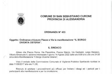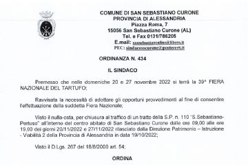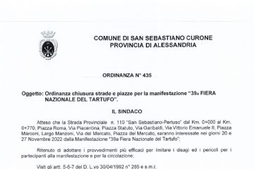 ORDINANZA SINDACALE N° 435 DI CHIUSURA STRADE E PIAZZE ALL'INTERNO DELL'ABITATO DI SAN SEBASTIANO CURONE NELLE DOMENICHE 20 E 27 NOVEMBRE 2022.