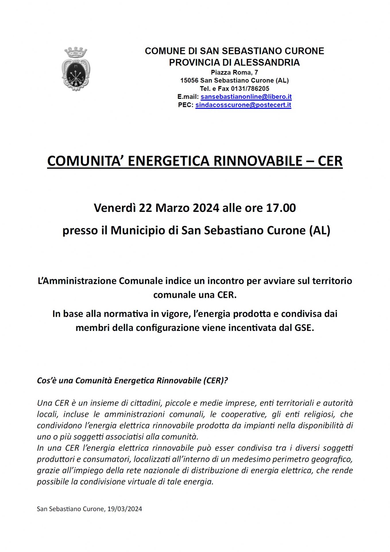 Venerdì 22 Marzo 2024 alle ore 17.00 presso il Municipio di San Sebastiano Curone (AL) l’Amministrazione Comunale indice un incontro per avviare sul territorio comunale una CER.