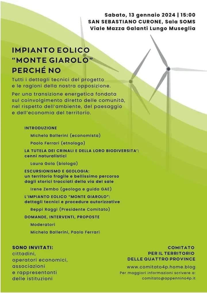 INCONTRO: IMPIANTO EOLICO MONTE GIAROLO PERCHE' NO - San Sebastiano Curone Sala SMS sabato 13 gennaio 2024 ore 15.00