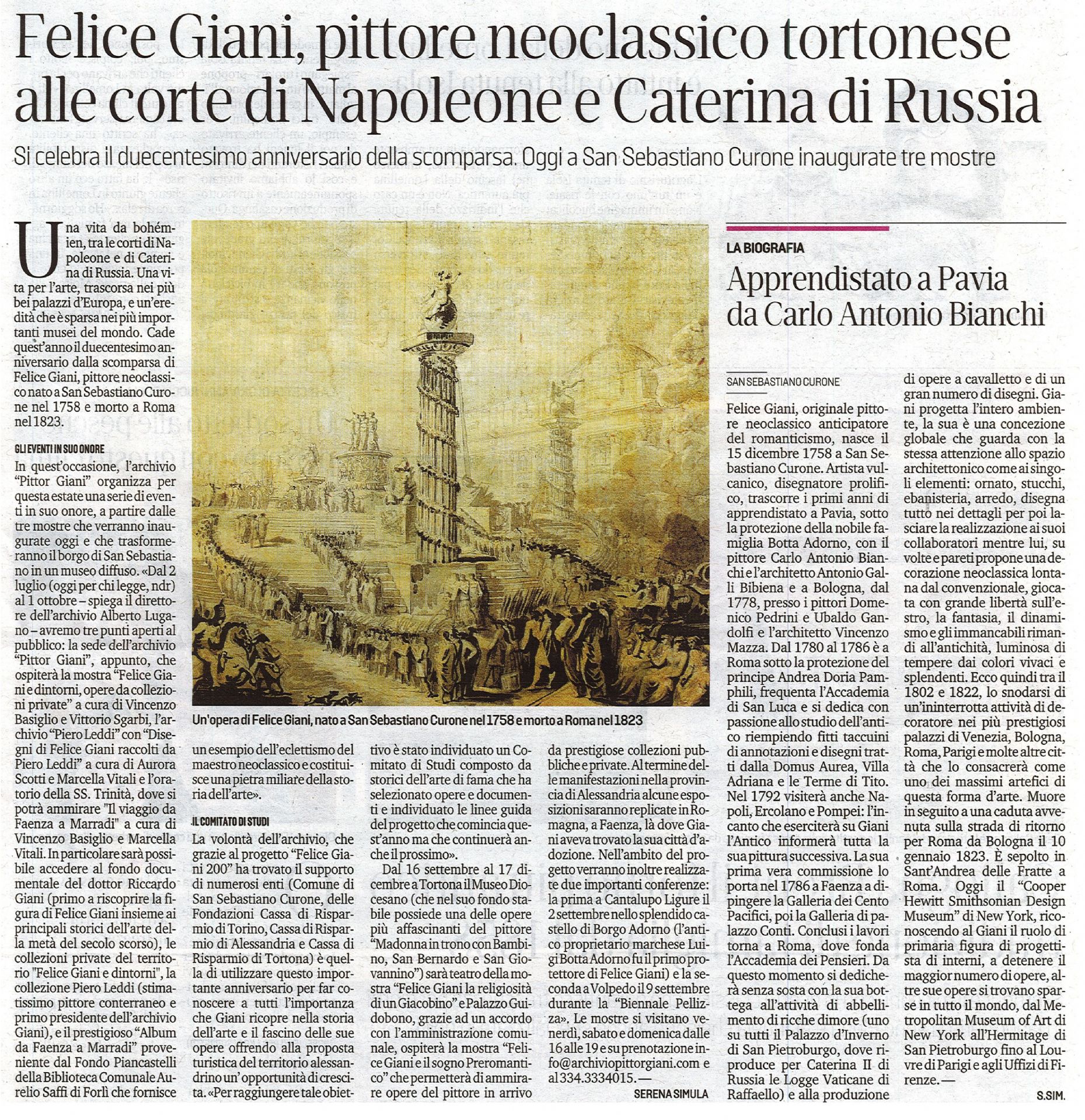 a San Sebastiano Curone 3 mostre dedicate a Felice Giani :
