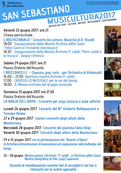 A partire dal 23 Giugno 2017 a San Sebastiano Curone si svolgera la manifestazione MUSICULTURA 2017 organizzata dalla Parrocchia di San Sebastiano Martire con il patrocinio dell'Amministrazione Comunale.