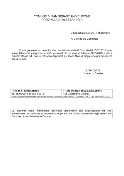 Si comunica che con deliberazione G.C. n. 18 del 15/02/2018 é stato approvato lo schema di bilancio 2018_2020 e che il bilancio stesso e i documenti sono depositati presso l'Ufficio di Segreteria dal 15/02/2018 al 6/3/2018