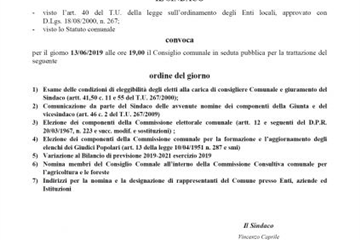 CONVOCAZIONE CONSIGLIO COMUNALE 13/06/2019 ORE 19,00