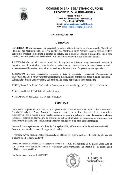 Si pubblica l'ordinanza Sindacale n° 390 del 04/04/2019.