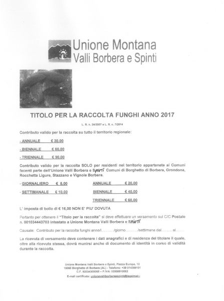 Il costo del tesserino per la raccolta funghi anno 2019 è il seguente: