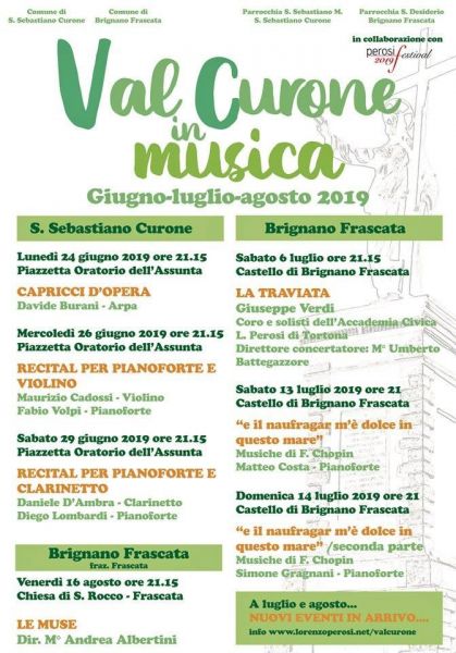 A San Sebastiano Curone si svolgeranno tre appuntamenti della manifestazione musicale "Val Curone In Musica" nei giorni 24 -26 - 29 Giugno a partire dalle ore 21.15