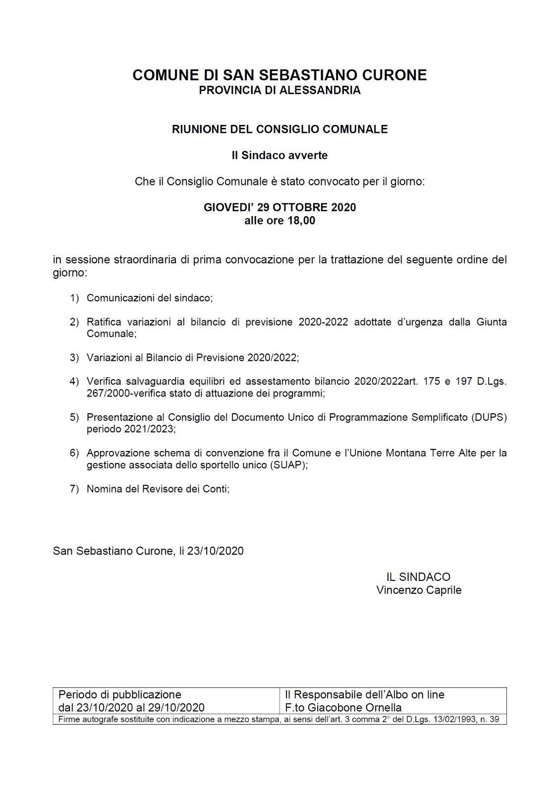 CONVOCAZIONE CONSIGLIO COMUNALE 29/10/2020 ORE 18,00