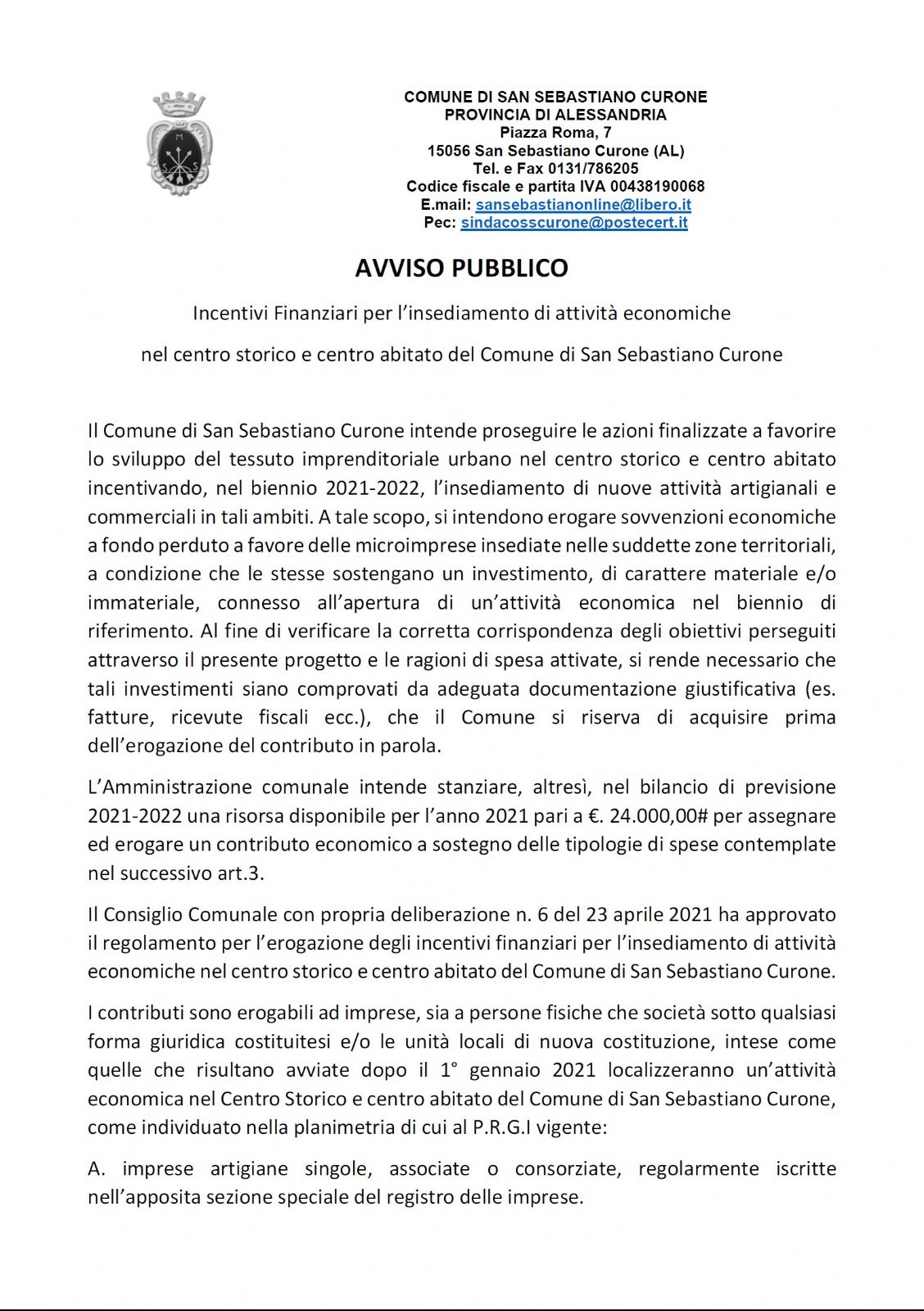 Le Imprese, sia persone fisiche che società sotto qualsiasi forma giuridica costituitesi e/o le unità locali di nuova costituzione che localizzeranno un'attività economica nel Centro Storico e Centro Abitato del Comune di San Sebastiano Curone, possono accedere ad un contributo a fondo perduto a loro destinato nel rispetto del Regolamento approvato dal Consiglio Comunale con deliberazione n. 6 del 23/04/2021.