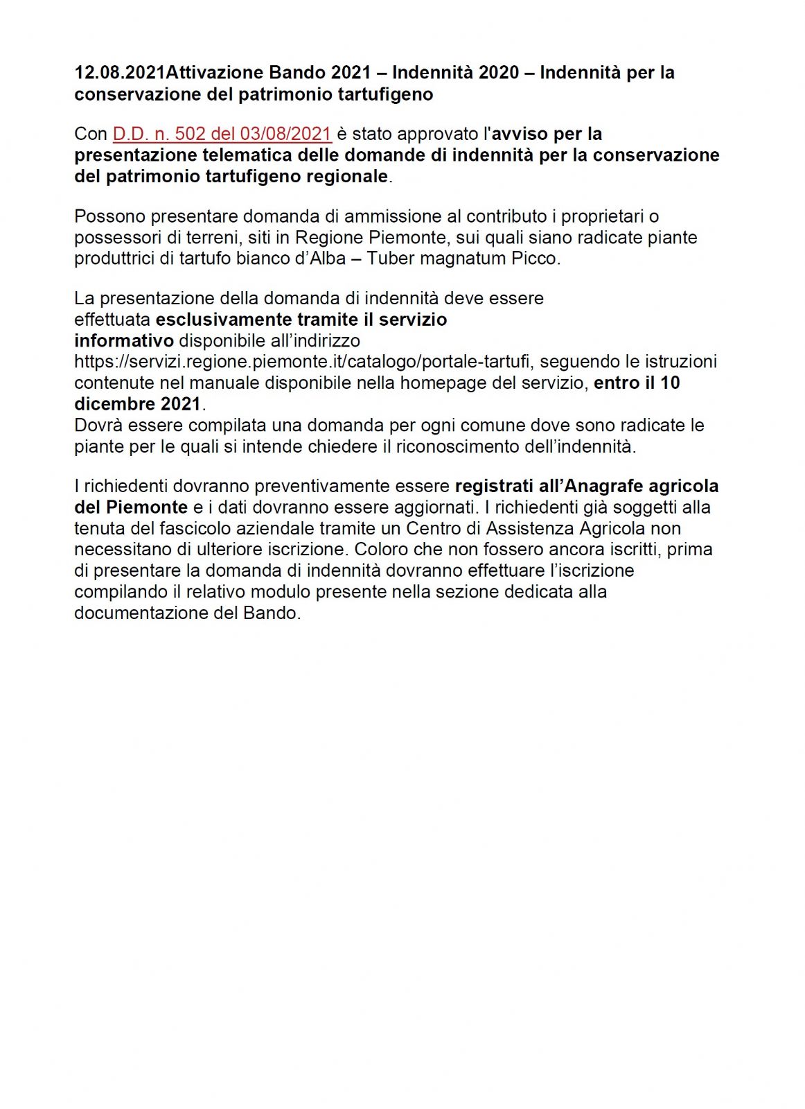 - Concessione di indennità per la conservazione del patrimonio tartufigeno[.pdf 337,43 Kb - 14/08/2021]