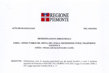 STATO DI MASSIMA PERICOLOSITA' INCENDI BOSCHIVI DAL 16/01/2022.