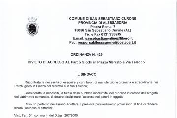 ORDINANZA SINDACALE N° 435 DI CHIUSURA STRADE E PIAZZE ALL'INTERNO DELL'ABITATO DI SAN SEBASTIANO CURONE NELLE DOMENICHE 20 E 27 NOVEMBRE 2022.