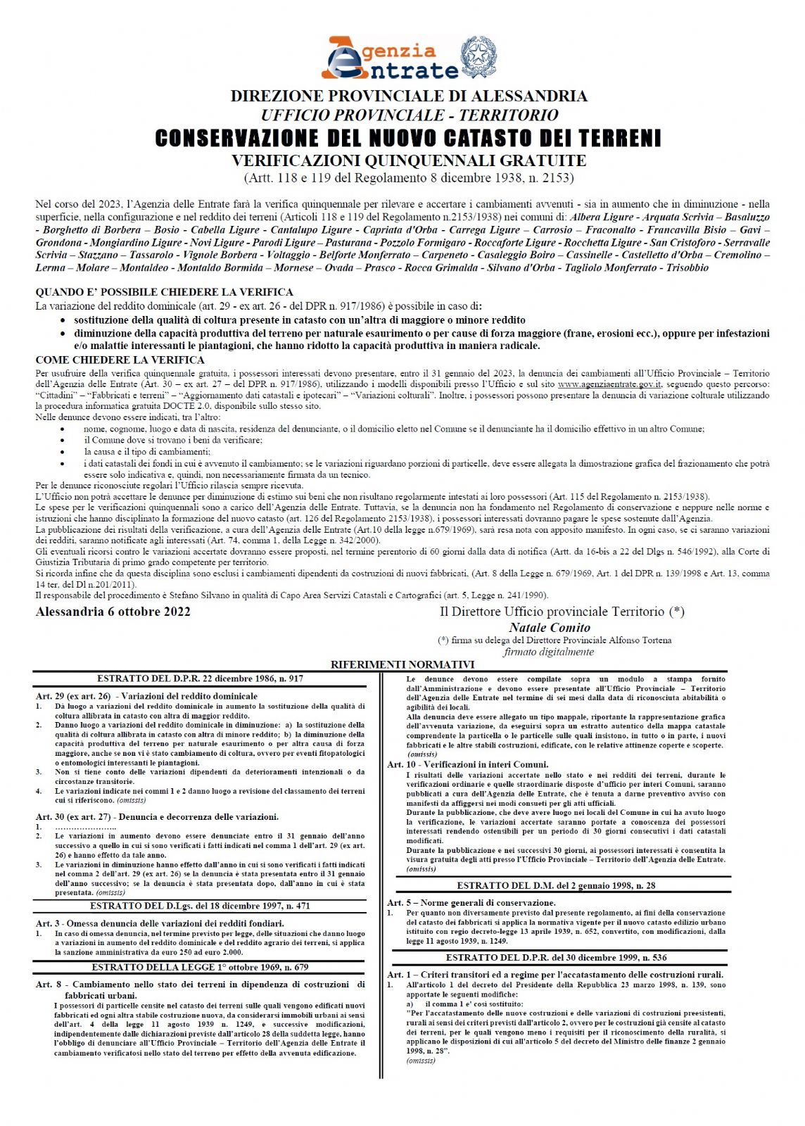 CONSERVAZIONE DEL NUOVO CATASTO TERRENI VERIFICAZIONI QUINQUENNALI GRATUITE - ARTT. 118 E 119 DEL REGOLAMENTO DI CONSERVAZIONE 8.12.1938, N. 2153.