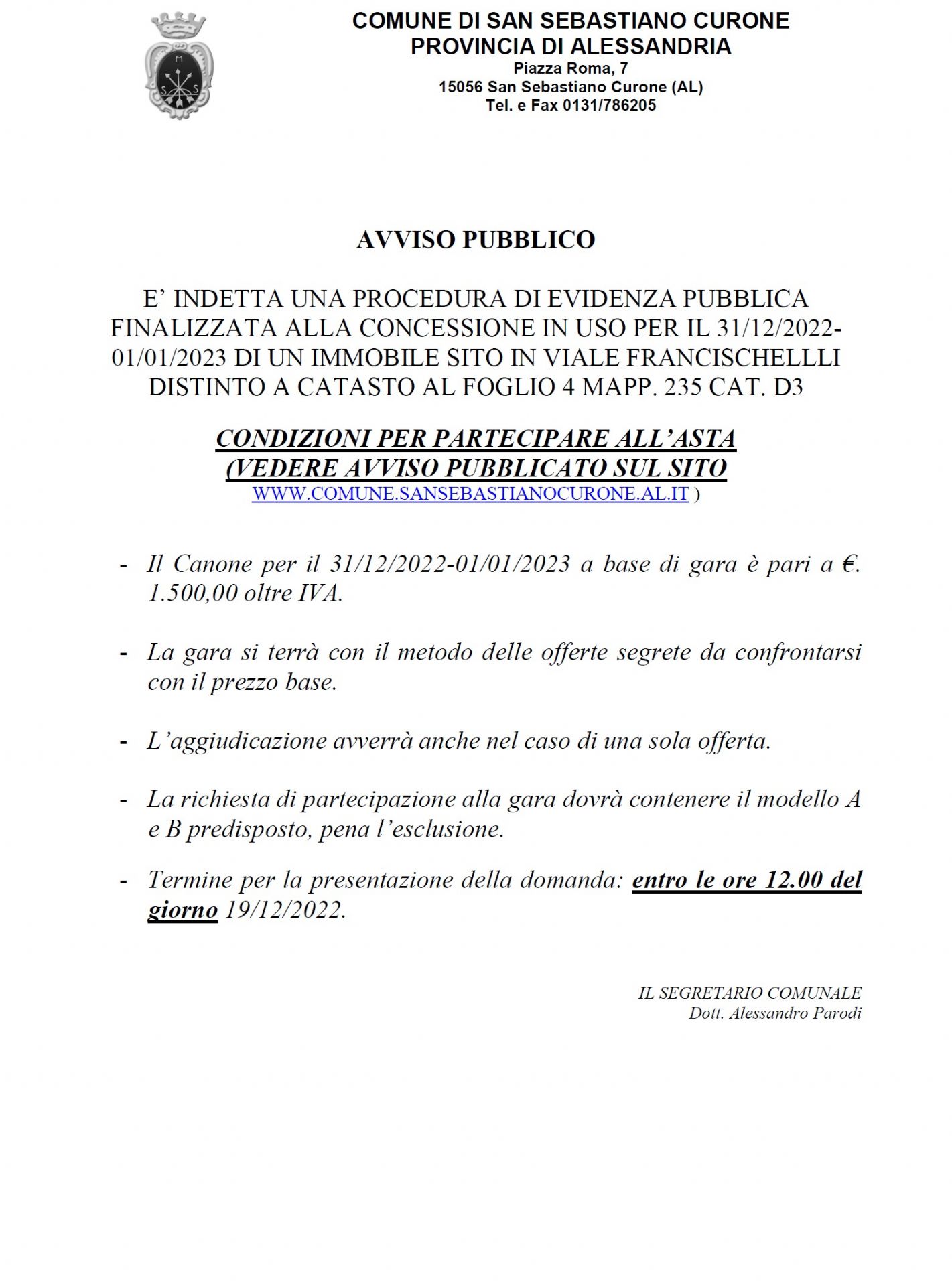 E'INDETTA UNA PROCEDURA DI EVIDENZA PUBBLICA FINALIZZATA ALLA CONCESSIONE IN USO DELL'IMMOBILE (SMS) PER IL 31/12/2022-01/01/2023 SITO IN VIALE FRANCISCHELLI DISTINTO A CATASTO AL FOGLIO 4 MAPP. 235 CAT. D3