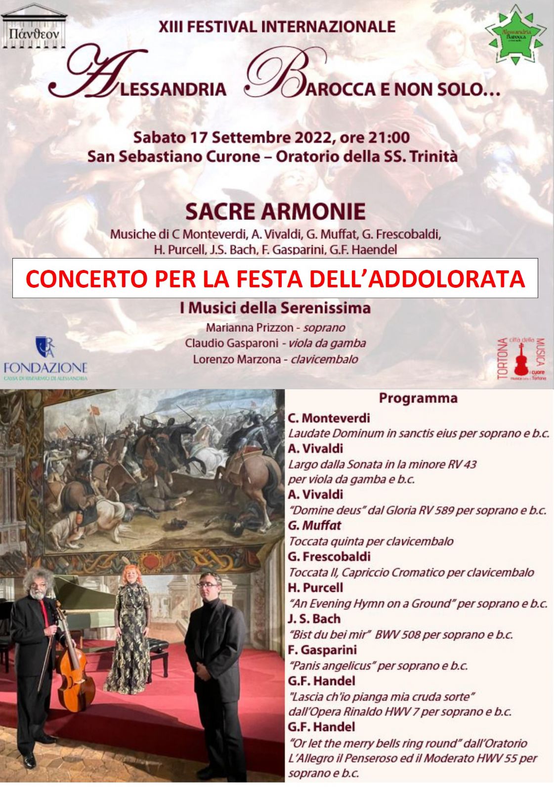 SABATO 17 SETTEMBRE P.V. ALLE ORE 21.00 PRESSO L'ORATORIO DELLA SS. TRINITA' IN SAN SEBASTIANO CURONE SI TERRA' IL CONCERTO "SACRE ARMONIE" CON I MUSICI DELLA SERENISSIMA.