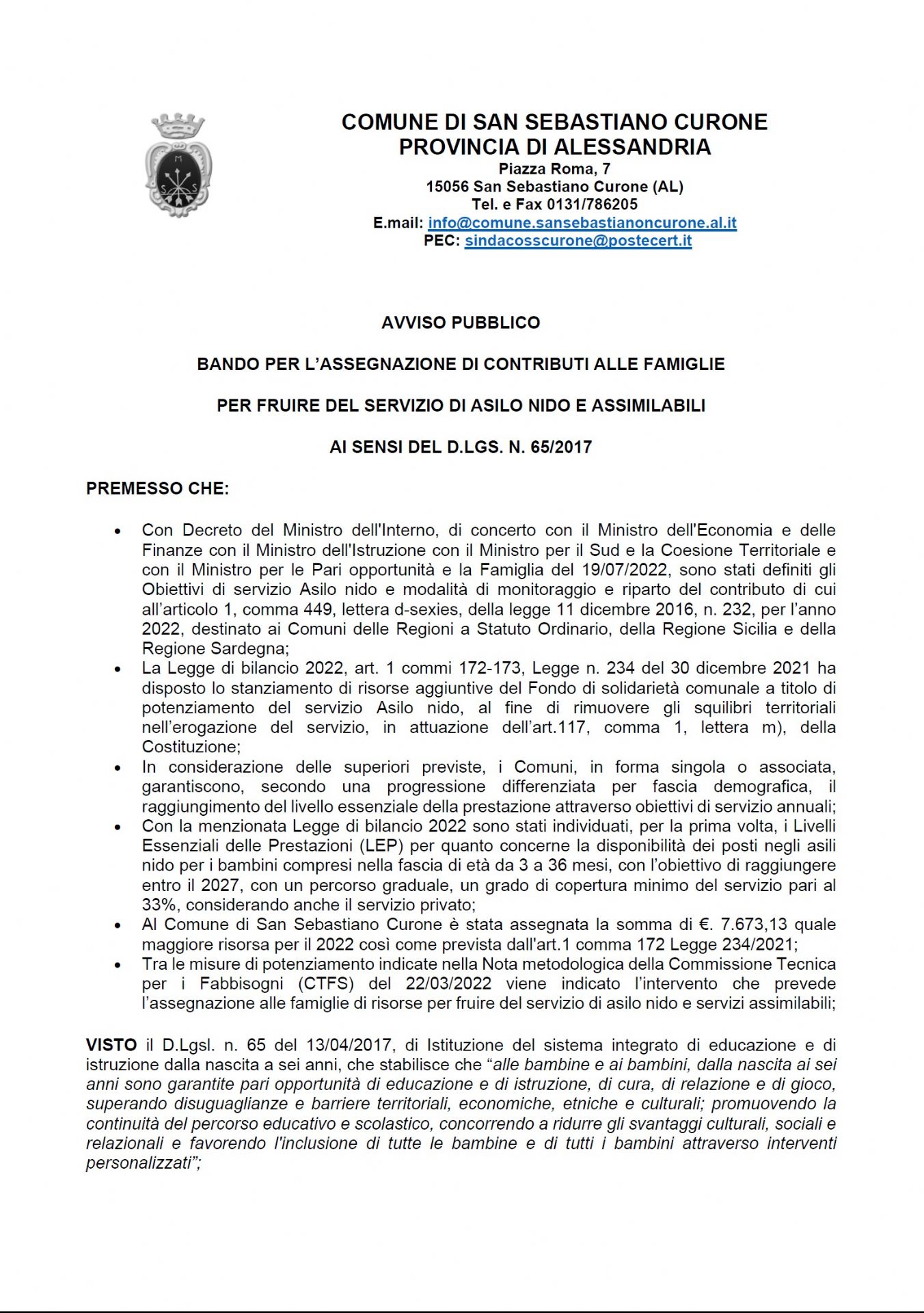 BANDO PER L'ASSEGNAZIONE DI CONTRIBUTI ALLE FMIGLIE PER FRUIRE DEL SERVIZIO DI ASILO NIDO E ASSIMILABILI AI SENSI DEL D.LGS. N. 65/2017
