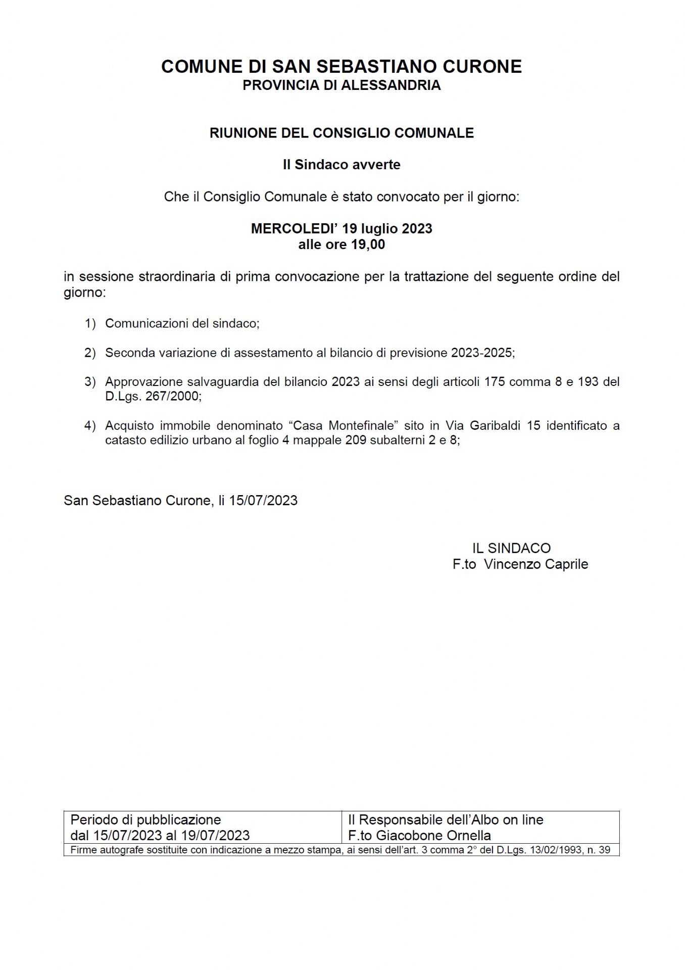 RIUNIONE DEL CONSIGLIO COMUNALE IN SEDUTA STRAORDINARIA DI PRIMA CONVOCAZIONE