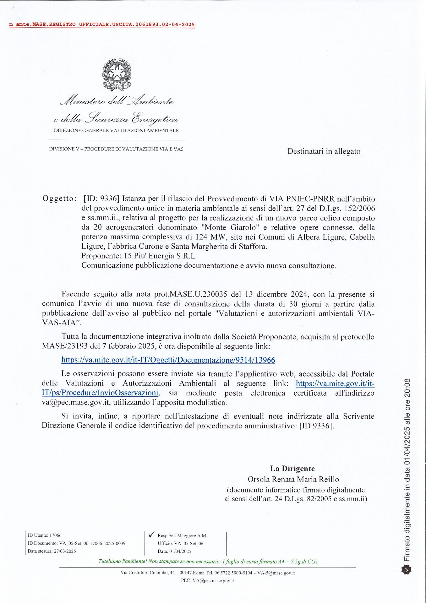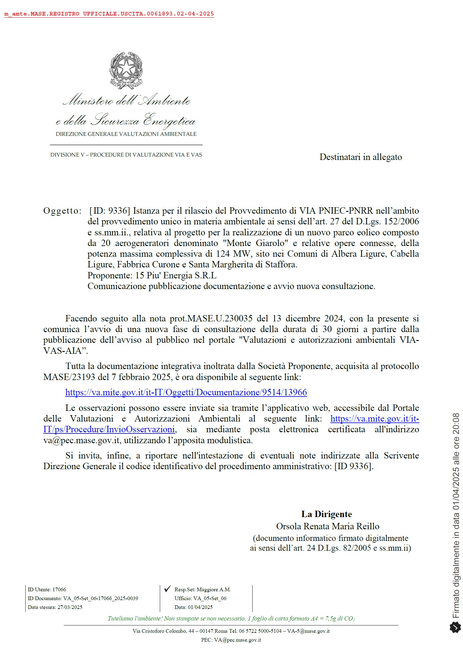 Protocollo nr: 61893 - del 02/04/2025 - MASE - Area Organizzativa Omogenea (AOO) MASE [ID: 9336] Istanza per il rilascio del Provvedimento di VIA PNIEC-PNRR nell'ambito del provvedimento unico in materia ambientale ai sensi dell'art. 27 del D.Lgs. 152/2006 e ss.mm.ii., relativa al progetto per la realizzazione di un nuovo parco eolico composto da 20 aerogeneratori denominato "Monte Giarolo" e relative opere connesse, della potenza massima complessiva di 124 MW, sito nei Comuni di Albera Ligure, Cabella Ligure, Fabbrica Curone e Santa Margherita di Staffora. Proponente: 15 Piu' Energia S.R.L Comunicazione pubblicazione documentazione e avvio nuova consultazione.