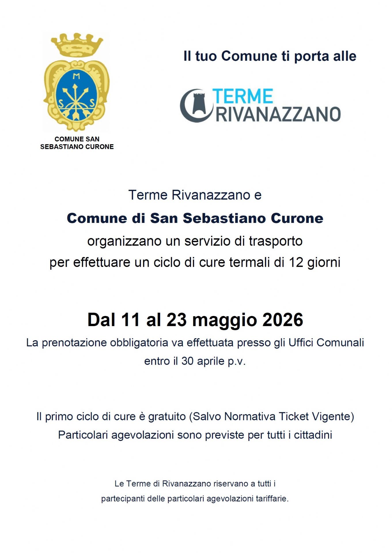 Il Comune di San Sebastiano Curone in collaborazione con Terme di Rivanazzano organizzano come ogni anno un servizio di trasporto per effettuare un ciclo di cure termali di 12 giorni.